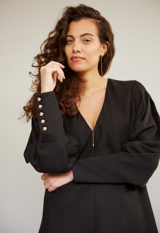SETERY - Luxuriöses Midi-Kleid mit Goldknöpfen - Schwarz